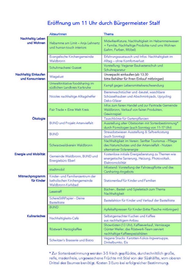 Am Samstag, den 24.09 findet ab 11 bis 17 Uhr die Veranstaltung im Kurhaus Waldbronn statt. Sie dürfen sich auf Aktionen wie Apfelpressen, Tauschbörse für Gartenpflanzen, Erfahrungsaustausche zum nachhaltigen Alltag ohne Komfortverlust und vieles mehr freuen.