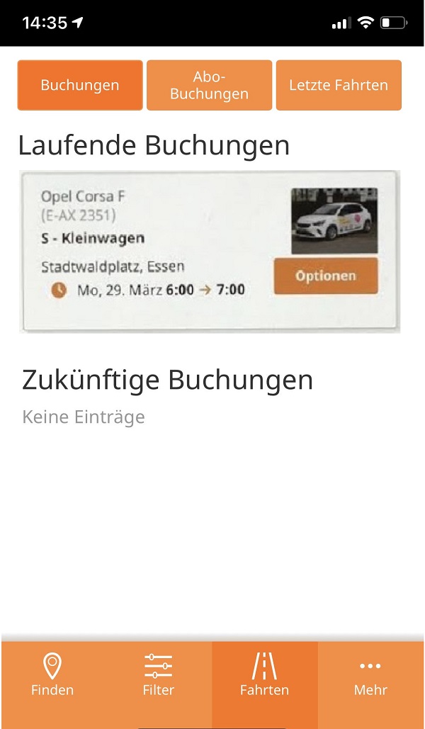 Neu ist künftig auch der Hinweis auf die Tankkarten-PIN des Fahrzeugs. Diese PIN erhalten Sie ab sofort in der „stadtmobil-App“. Rufen Sie dort Ihre laufende Buchung auf: Unter dem Button „Optionen“ finden Sie die Anzeige der Tankkarten-PIN.