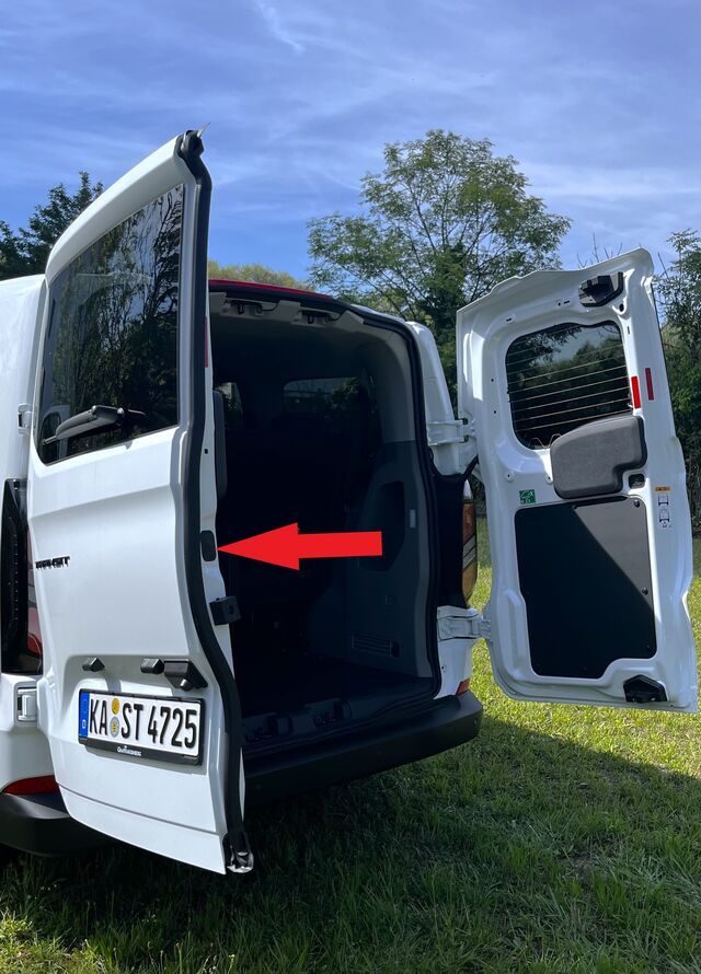 Zum Öffnen der Kofferraum Türen die entsprechende Taste auf dem Fahrzeugschlüssel drücken. Erst die rechte, dann die linke Tür öffnen. Zum Öffnen der linken Tür den schwarzen Knopf innen an der Türkante unterhalb des Fensters drücken.