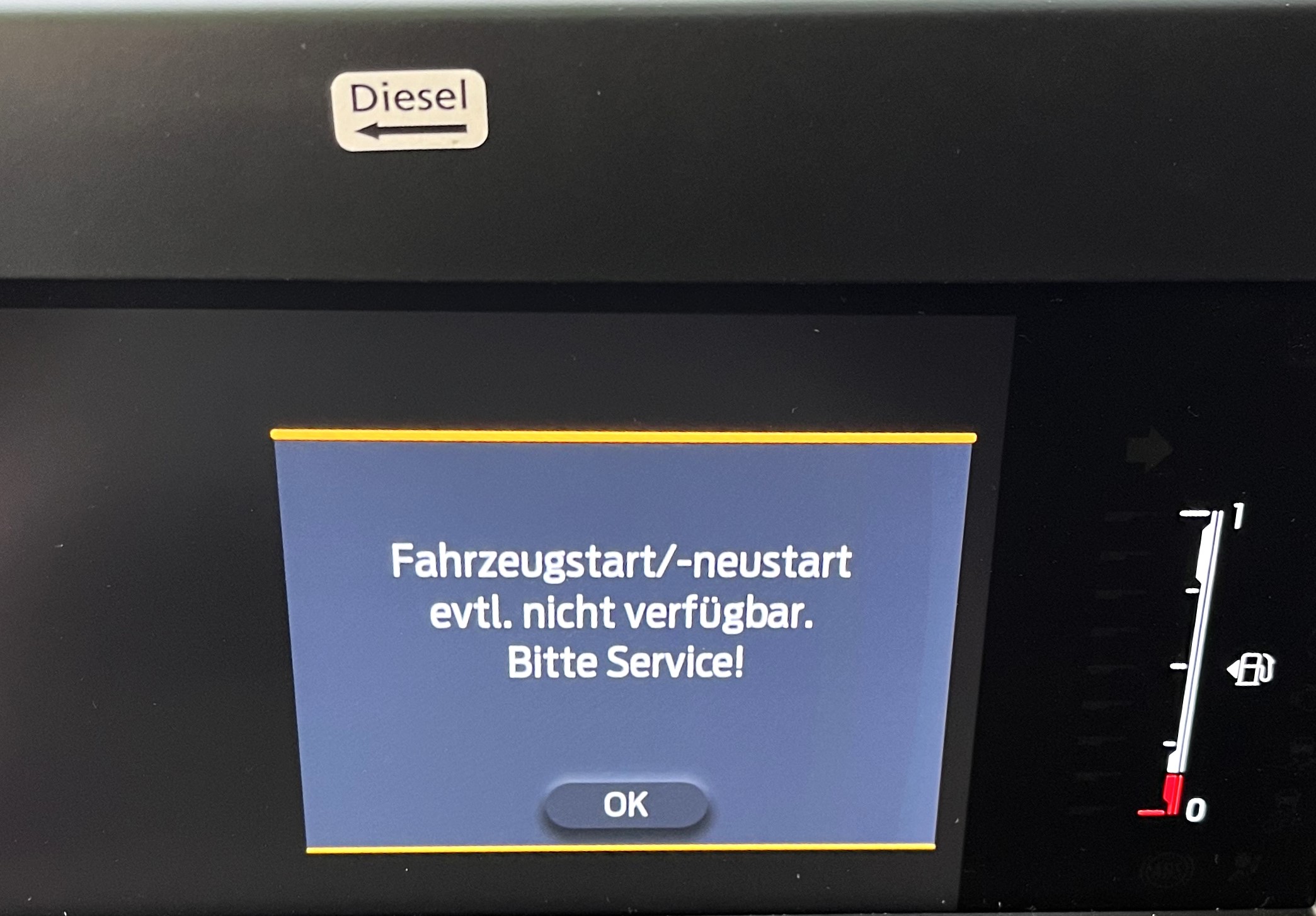 Nach dem Motorstart wird folgende Meldung „Fahrzeugstart/-neustart evtl. nicht verfügbar. Bitte Service!“ angezeigt. Diese Meldung wird manchmal begleitet von: „Fahrzeugservice in Kürze“ und einem gelben Schraubenschlüssel.