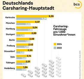 Im Rahmen des Städterankings erhebt der Bundesverband Carsharing (bcs) die Anzahl der Carsharing-Fahrzeuge in deutschen Kommunen ab 50.000 Einwohner*innen und berechnet, wie viele Fahrzeuge pro 1.000 Einwohner*innen verfügbar sind. Das Städteranking wird alle zwei Jahre durchgeführt. Die neueste Erhebung fand im Herbst 2024 statt.