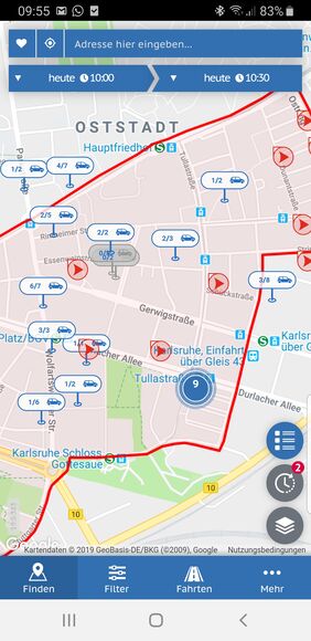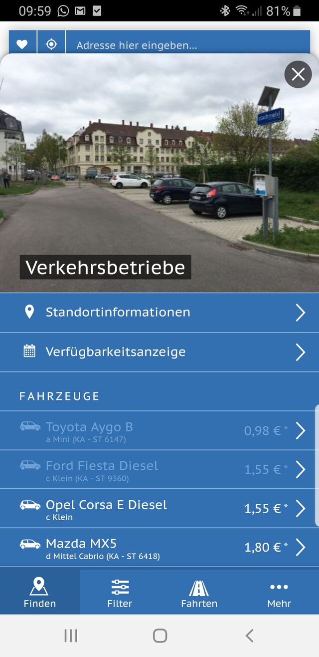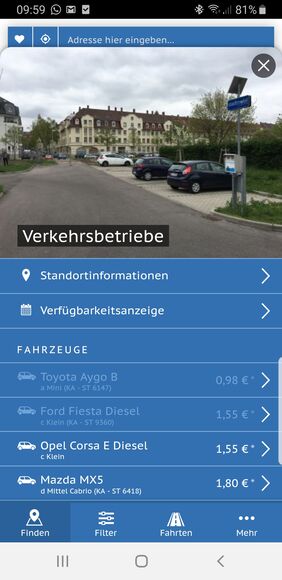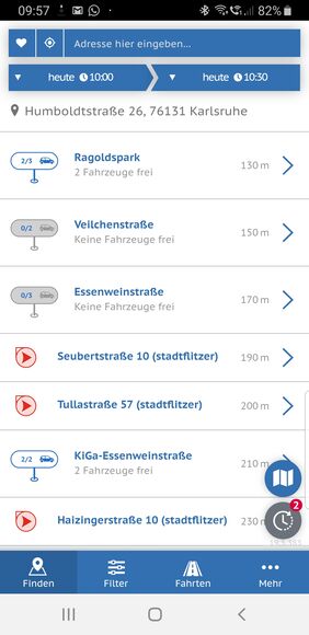 Einfach einloggen und Adresse eingeben oder einen Ihrer gespeicherten Adressen auswählen. Schon werden die verfügbaren Fahrzeuge in Ihrer Umgebung angezeigt, wahlweise im Listen- oder im Kartenmodus.