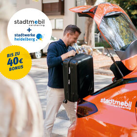 Sie beziehen bereits eines der Ökostrom-Produkte* der Stadtwerke Heidelberg? Dann ist der Einstieg ins Carsharing für Sie besonders günstig. Beim Abschluss eines stadtmobil-Vertrags gibt es einen Rabatt in Höhe von 29 Euro auf den Tarifstart – für Gewerbekunden sogar einen Rabatt in Höhe von 39 Euro. stadtmobil benötigt lediglich die Kopie der Auftragsbestätigung über den Abschluss des Ökostrom-Produktes*.