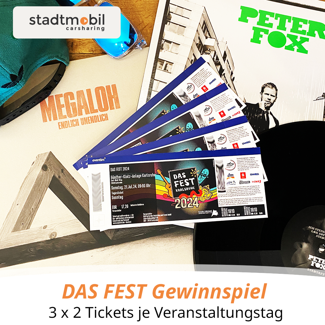 Schreiben Sie eine Mail mit dem Betreff “DAS FEST 2024” und Ihren beiden Antworten, Ihrer Teilnehmernummer und für welchen Tag Sie gerne Tickets gewinnen möchten bis Freitag, den 12.07.2024 um 12 Uhr an marketing(at)karlsruhe.stadtmobil.de.